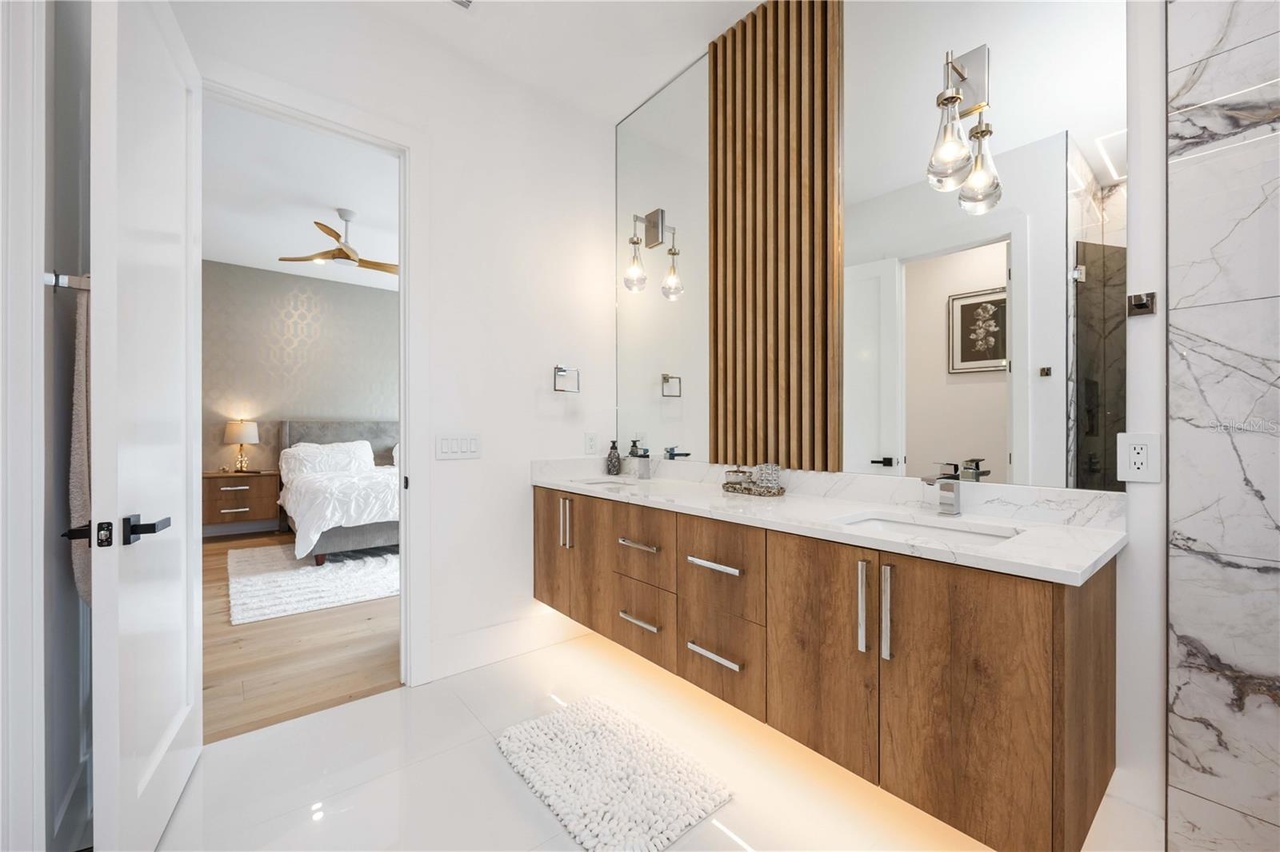 A sophisticated primary bathroom featuring a floating double-vanity with warm wood cabinetry and marble countertops, anchored by a striking vertical wooden slat accent wall and paired pendant lights. Large-format marble tile flooring and a frameless glass shower enclosure convey understated luxury, while the warm wood tones and soft brass hardware elevate the transitional design with organic warmth.