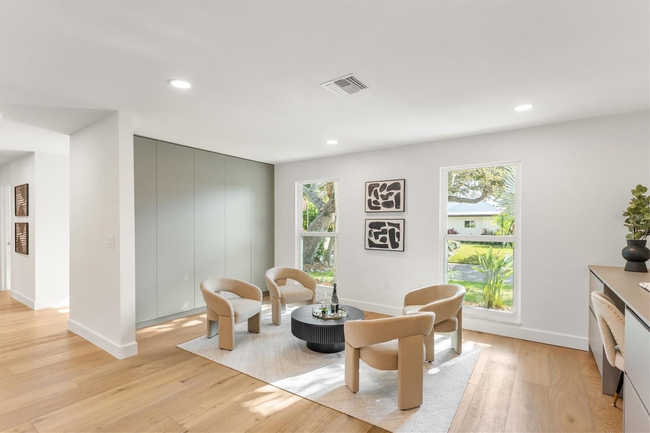 A serene, light-filled living room featuring organic modern design with sculptural curved wood furniture upholstered in natural linen, arranged around a black circular accent table. Sage green floor-to-ceiling millwork and expansive windows framing lush garden views create a sophisticated yet inviting retreat that seamlessly blends interior comfort with outdoor connectivity.