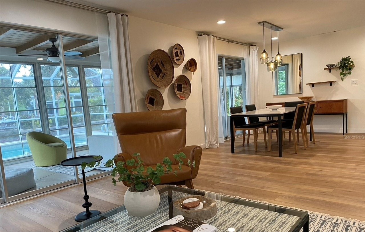 A sophisticated open-concept living and dining area that seamlessly blends transitional and organic modern design through warm natural materials, abundant light from floor-to-ceiling windows, and carefully curated furnishings. The space features a striking cognac leather wingback chair, statement brass pendant lighting, woven basket wall art, and refined mid-century-inspired pieces set against soft cream walls and rich hardwood flooring, creating a serene yet luxurious atmosphere.