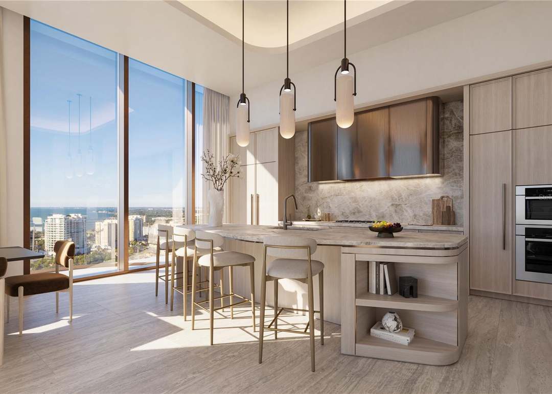 This ultra-luxury penthouse kitchen showcases organic modern design with a sophisticated palette of warm neutrals, complemented by floor-to-ceiling windows offering expansive city and waterfront views. The sculptural waterfall marble island, brass-accented pendant lighting, and seamlessly integrated appliances create a gallery-like culinary space that balances warmth and contemporary elegance.