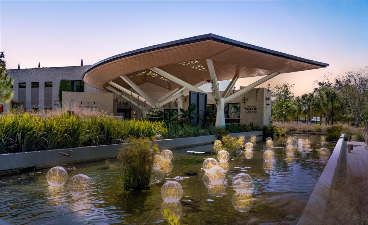 A stunning outdoor pavilion with a sweeping curved roof canopy and natural wood plank ceiling, anchoring a sophisticated entertaining space adjacent to a serene water feature with floating sculptural elements. The design seamlessly blends organic landscape integration with contemporary architectural language, creating a luxurious resort-like retreat that prioritizes fluid indoor-outdoor living.