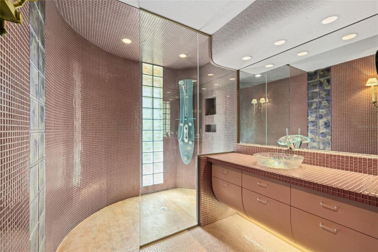 Walk In ShowerDouble VanityFrameless Glass EnclosureVessel SinkLarge MirrorPendant LightingRecessed LightingStatement ShowerheadCustom MillworkHigh Ceilings