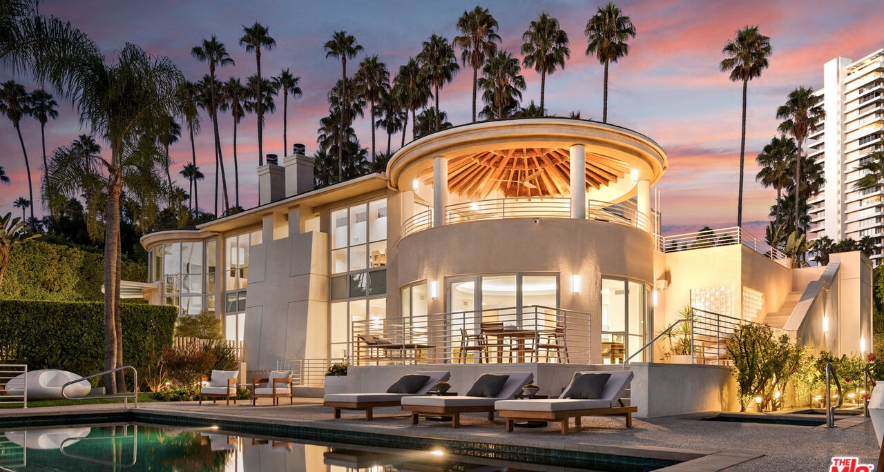 A stunning modernist poolside retreat with a sculptural white building featuring a dramatic domed ceiling and curved glass walls that frame lush palm trees and an infinite pool. The space seamlessly blends indoor-outdoor living with warm natural materials, resort-style lounge seating, and soft architectural lighting creating a serene, high-end sanctuary perfect for desert luxury living.