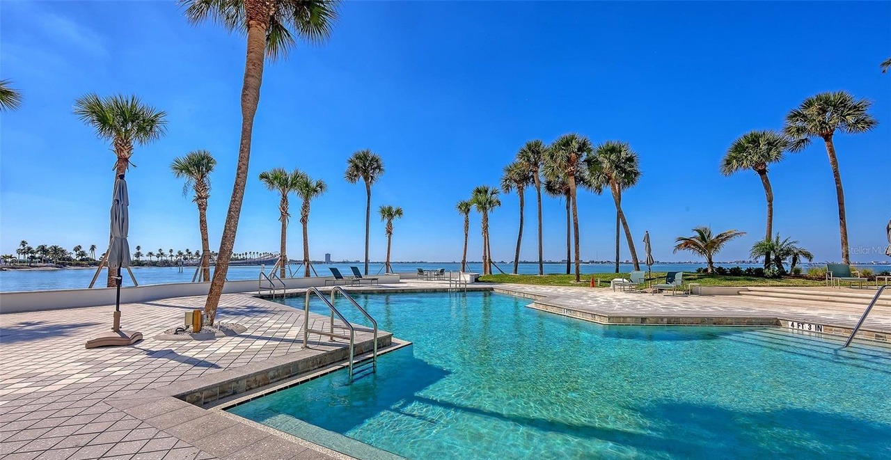 A stunning waterfront pool area with crystal-clear turquoise water, lined with elegant palm trees and modern concrete decking that creates a resort-style atmosphere. The abundant natural light, open layout, and serene bayou views deliver a sophisticated tropical oasis perfect for luxury waterfront living.