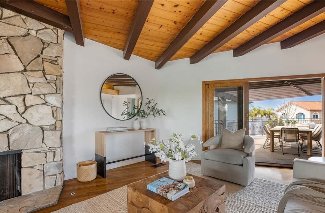 A sophisticated open-concept living room featuring dramatic exposed wood ceiling beams, a statement stone fireplace, and abundant natural light from expansive glass doors opening to a seaside patio. The space blends organic natural materials—stone, warm wood tones, linen upholstery—with clean modern lines, creating an effortlessly luxurious coastal-inspired sanctuary.
