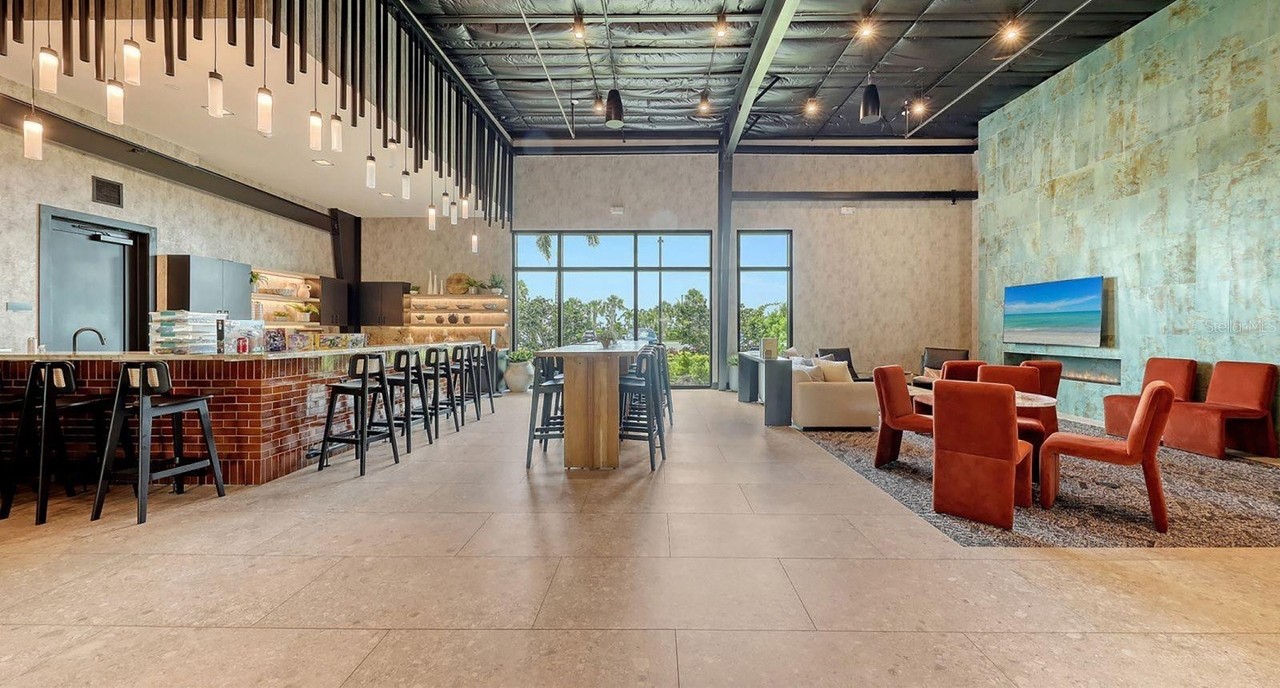 A stunning open-concept lounge with soaring exposed beam ceilings and abundant natural light from expansive floor-to-ceiling windows overlooking manicured landscaping. The space artfully blends warm taupe wallpapered walls, natural stone flooring, and custom statement pendant lighting with modern furnishings in rust-orange and teal tones, creating a sophisticated yet inviting atmosphere with organic modern sensibility.