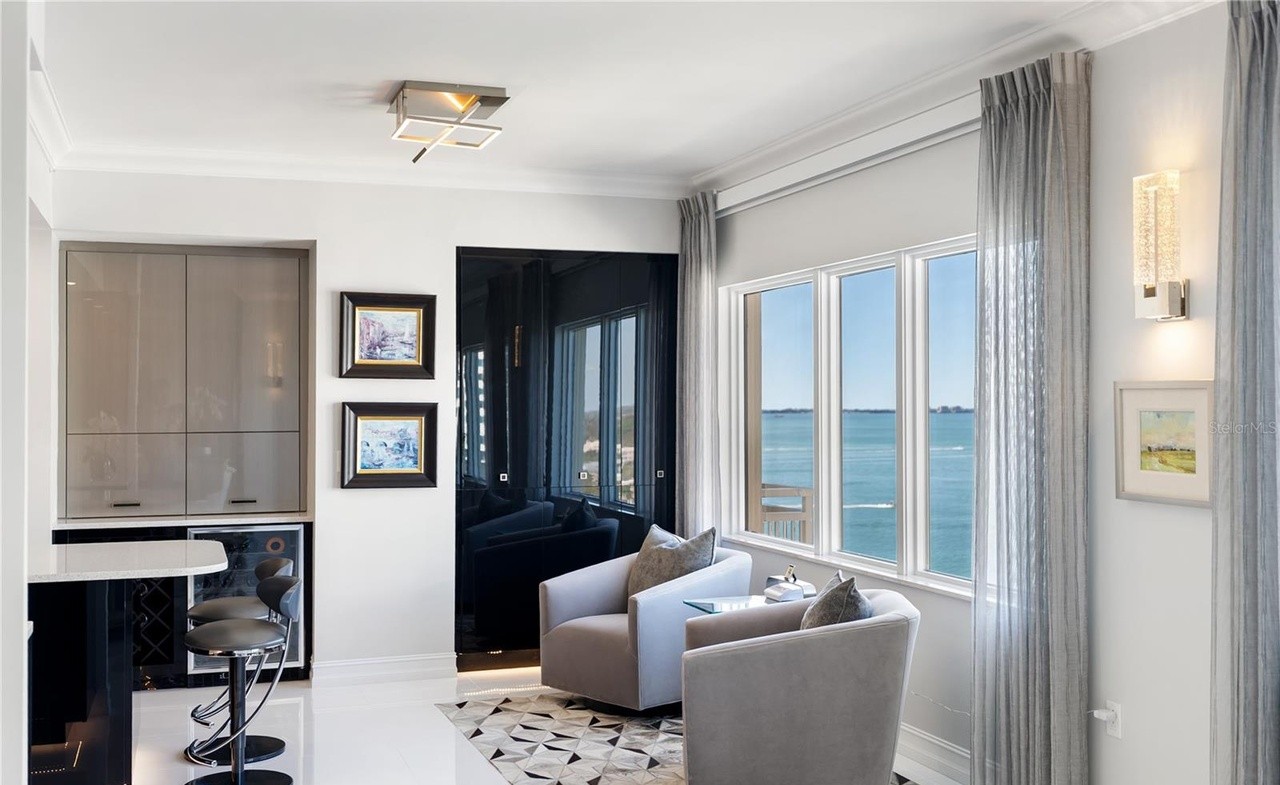 A stunning waterfront primary bedroom suite featuring floor-to-ceiling ocean-view windows, refined transitional design with coastal undertones, and impeccable finishes including marble flooring, custom gray cabinetry, and elegant gray linen drapery. The room balances formal elegance with serene, light-filled beachy sophistication.