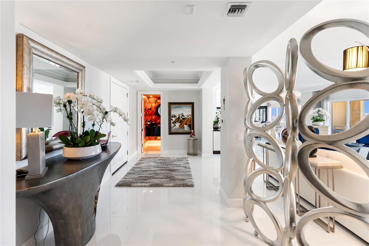 A stunning foyer hallway featuring polished marble flooring, coffered white ceiling with recessed lighting, and curated design elements including a sculptural silver-metallic mirror, white orchids in a cream vessel, and bold contemporary artwork. The space exudes sophisticated luxury with a warm neutral palette accented by brass and gold tones, expertly balanced between formal transitional millwork and dramatic glam styling.