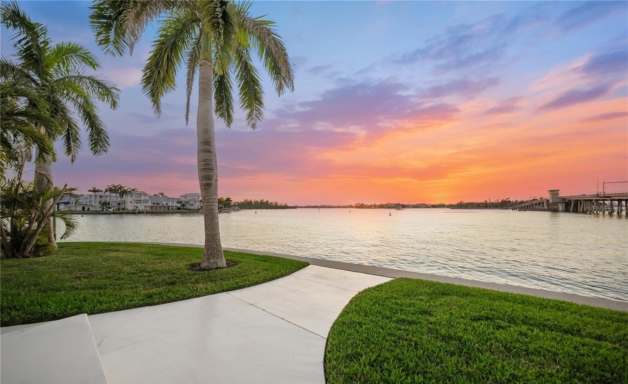 A stunning waterfront estate patio captured at golden hour, featuring manicured tropical landscaping with mature palm trees, a clean concrete walkway, and panoramic views of a calm waterway lined with luxury homes and a distant bridge. The serene composition exemplifies high-end waterfront living with organic landscape design and abundant natural light.