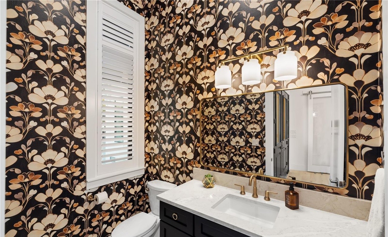 A striking powder room featuring a dramatic botanical floral wallpaper in cream and gold tones on a deep black background, paired with a sleek black vanity, white marble countertop, and brass hardware for a sophisticated, high-impact glam aesthetic. The mirrored wall and layered lighting create an elegant, luxurious atmosphere that balances bold pattern with refined materials.