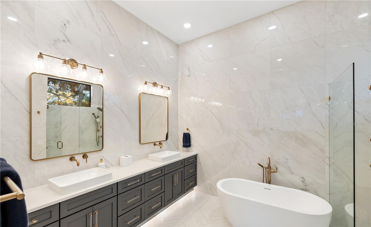 A sophisticated primary bathroom showcasing luxurious finishes with large-format marble walls, dark gray floating vanities with quartz countertops, and brass accents that provide warmth against cool marble surfaces. The space elegantly combines a freestanding soaking tub and frameless walk-in shower with professional-grade lighting and contemporary fixtures, creating a spa-like sanctuary with timeless appeal.