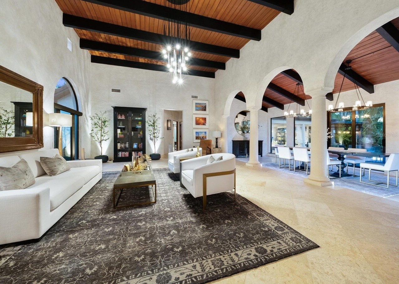 A stunning contemporary great room featuring exposed warm-wood ceiling beams with dramatic black accents, soaring arched doorways, and abundant natural light flowing through expansive windows overlooking a pool area. The space masterfully blends Mediterranean architectural elements with organic modern furnishings, cream marble flooring, and sophisticated neutral tones punctuated by statement brass lighting and black accents, creating a serene yet luxurious sanctuary.