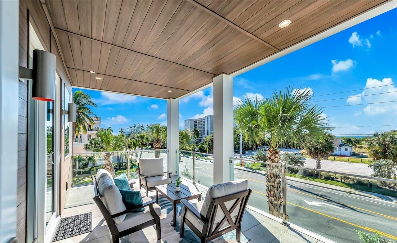 A sophisticated covered patio with a wood-plank ceiling and recessed lighting, offering expansive waterfront and coastal views through floor-to-ceiling glass and glass railings. The space is furnished with contemporary outdoor seating in neutral tones, creating a serene coastal retreat that seamlessly blends indoor luxury with outdoor living.