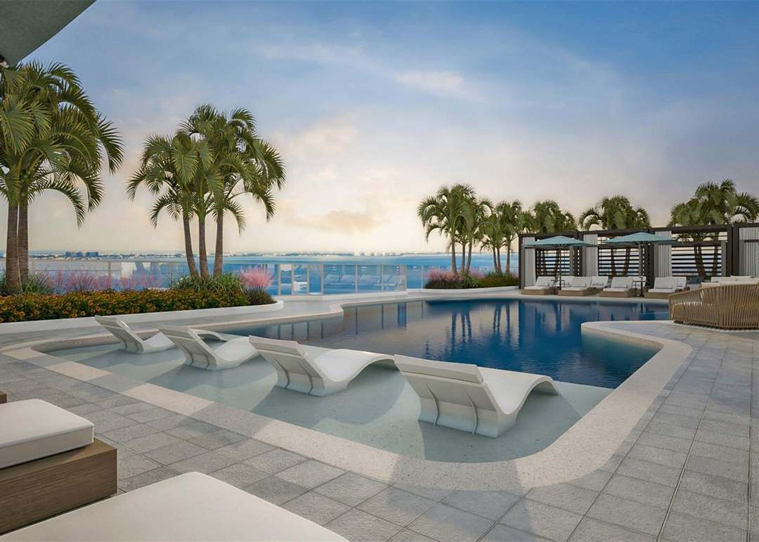 A stunning ultra-luxury waterfront pool area featuring a pristine blue infinity pool with sculptural white lounge chairs, tropical palm landscaping, and sweeping bay views. The sophisticated design seamlessly blends contemporary minimalism with coastal elegance through a restrained palette of white, gray, and blue accents, creating an exceptionally serene and resort-like outdoor sanctuary.