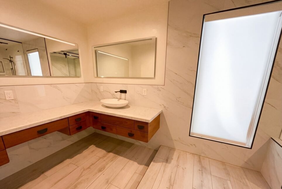Double VanityFloating VanityFrameless Glass ShowerLarge Format Marble TileVessel SinkLighted MirrorsRecessed LightingMarble Surround