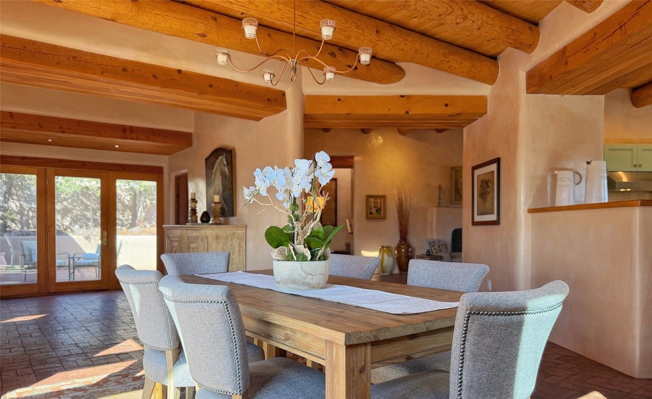 A sophisticated, light-filled dining room featuring rustic timber ceiling beams paired with contemporary furnishings and warm, neutral plaster walls that create an inviting transitional aesthetic. The space seamlessly blends organic materials with modern design sensibilities, accentuated by a striking brass chandelier and upholstered seating in soft neutral tones, with abundant natural light from adjacent glass doors overlooking an outdoor terrace.