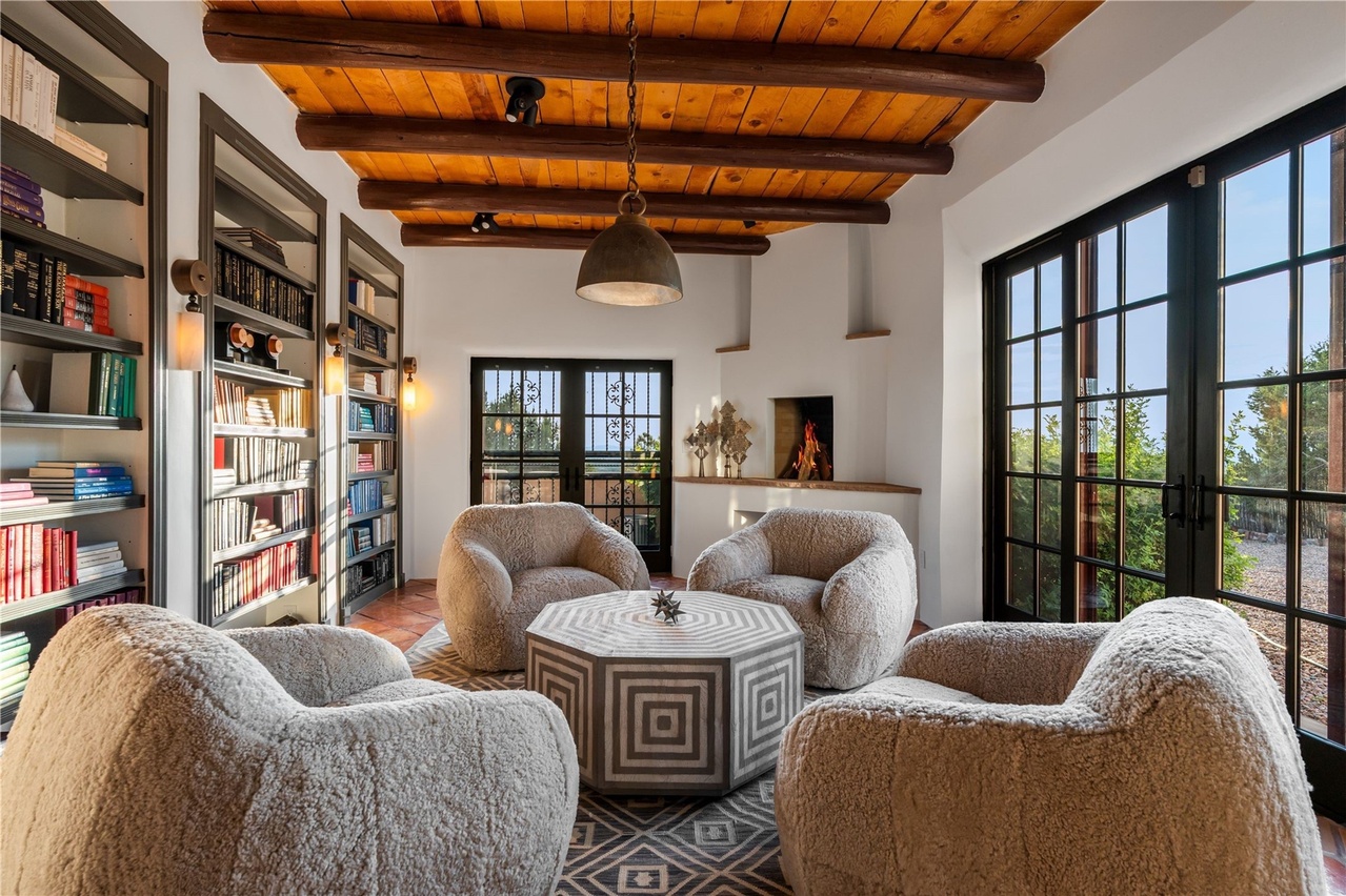 Built In ShelvingExposed BeamsHigh CeilingsFloor To Ceiling WindowsStatement LightingOpen ShelvingCustom MillworkFireplaceCurved Furniture