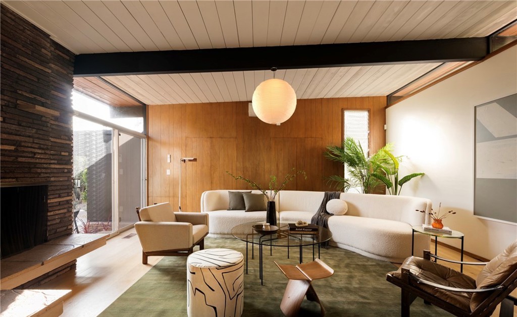 A sophisticated mid-century modern living room featuring warm wood-paneled walls, exposed black beams, and a floating white sphere pendant light that anchors the space. The room masterfully blends organic warmth with clean modern lines through layered natural materials—teak-toned wood, cream upholstery, sage green carpet, and curated furnishings—creating a serene yet luxurious retreat with abundant natural light from expansive windows and a dramatic fireplace focal point.