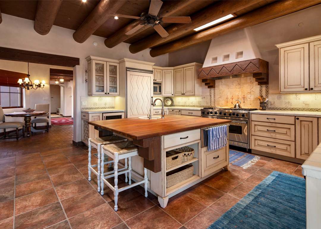 An exceptionally well-appointed transitional kitchen featuring a striking warm wood waterfall island with cream cabinetry, professional-grade appliances, and dramatic exposed timber beams overhead. The room seamlessly blends traditional architectural elements (crown molding, detailed millwork) with warm natural materials (butcher block, terracotta tile flooring) and contemporary lighting, creating a sophisticated yet inviting culinary space with abundant natural light.