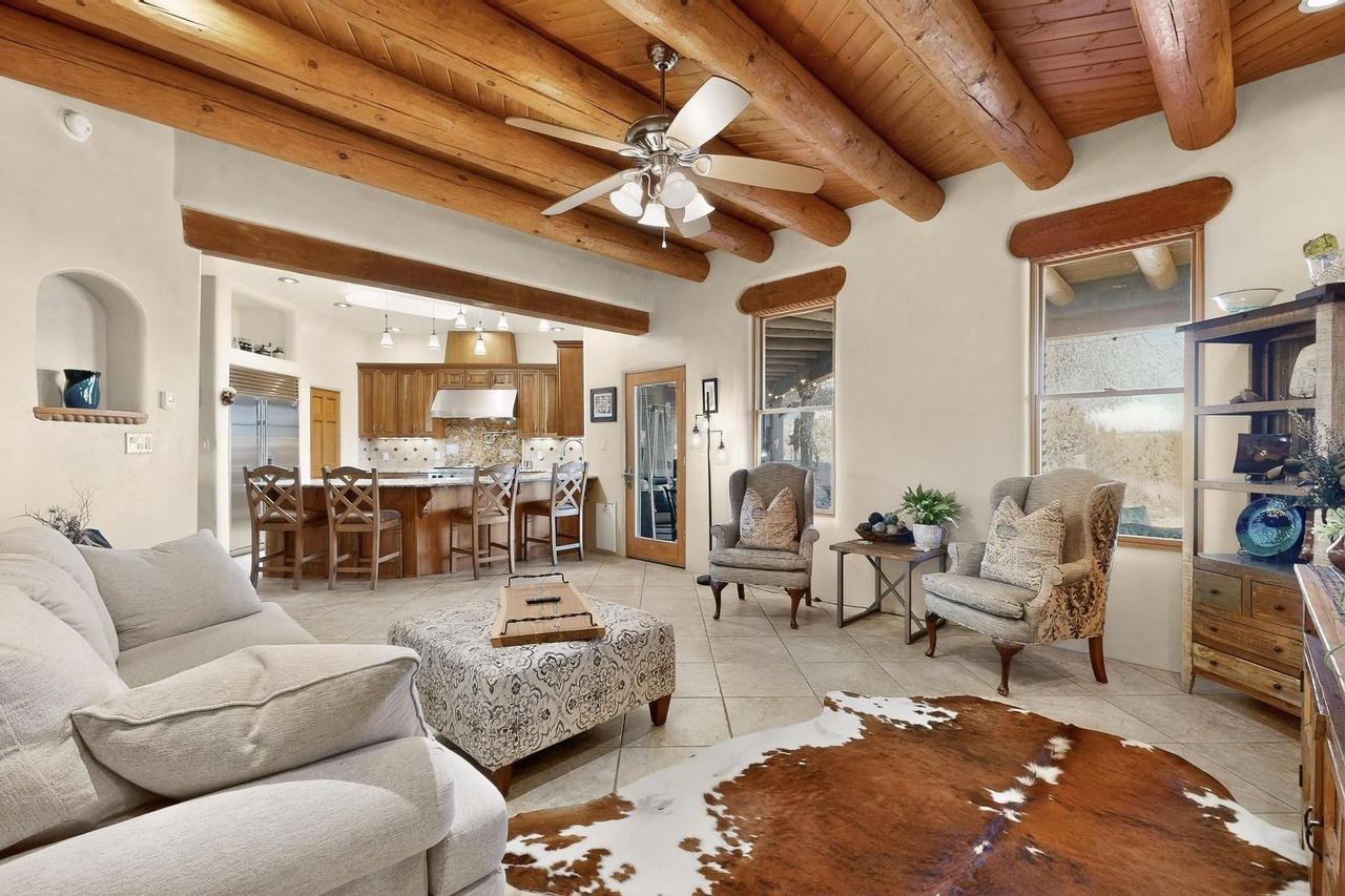 This stunning open-concept great room seamlessly blends a fully equipped kitchen with a spacious living area, unified by dramatic exposed wood beam ceilings and abundant natural light from expansive windows. The warm, layered palette of cream walls, natural wood cabinetry, neutral upholstery, and authentic cowhide accents creates an inviting, sophisticated desert-inspired sanctuary that feels both luxurious and lived-in.