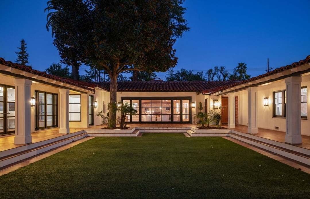This stunning Spanish Colonial courtyard patio features a symmetrical, colonnaded design with cream stucco walls, terracotta tile roof, and lush mature trees creating a serene Mediterranean escape. The space showcases exceptional architectural detailing with arched openings, crown molding, and professional lighting, exemplifying classic California estate elegance with perfect integration of indoor-outdoor living.