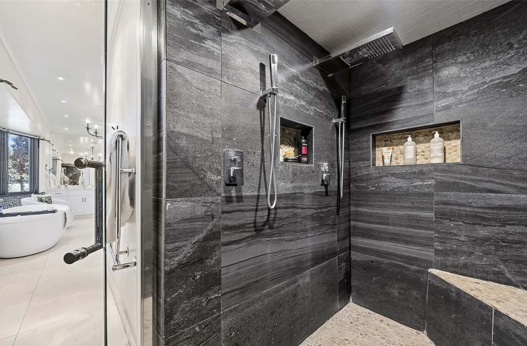 A spa-like primary bathroom featuring a dramatic walk-in shower clad entirely in large-format charcoal tile with dual rainfall showerheads, frameless glass enclosure, and chrome hardware. The minimalist design emphasizes natural materials, clean lines, and a serene monochromatic palette punctuated by strategically placed grooming products in recessed niches.