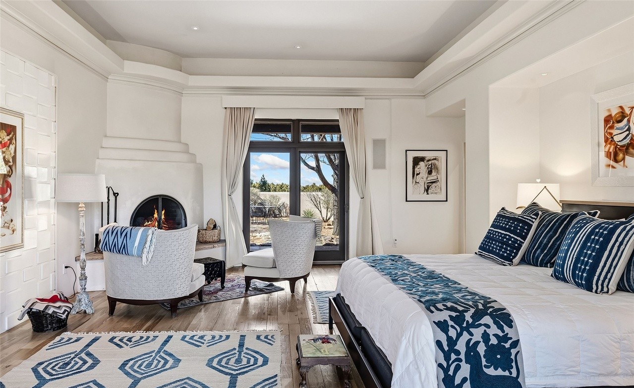 A serene primary bedroom suite featuring a sophisticated Hamptons aesthetic with crisp white architectural details, navy and white textiles, and a cozy fireplace seating area. The room is flooded with natural light from expansive French doors opening to an outdoor landscape, while rich hardwood flooring and refined crown molding create an elegant, timeless backdrop.