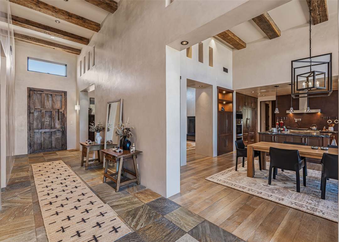 A sophisticated transitional entryway featuring exposed timber beams, high ceilings, and a striking inlaid hardwood floor runner that guides traffic toward an open-concept kitchen and dining area. The space combines traditional architectural details with modern furnishings and finishes, creating a warm yet refined introduction to this luxury home.