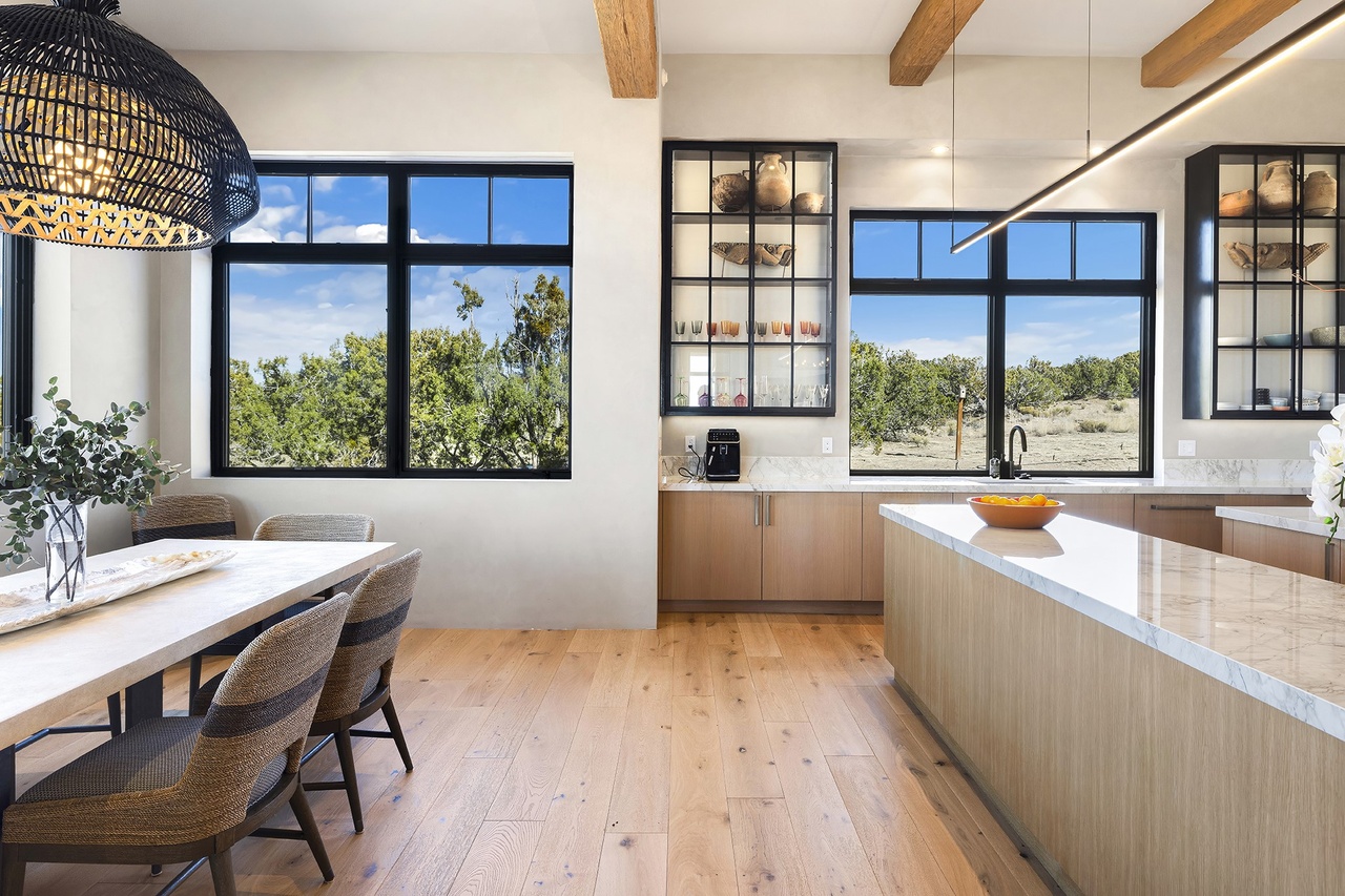 A stunning open-concept kitchen featuring abundant natural light through floor-to-ceiling black-framed windows overlooking desert landscape, with light wood cabinetry, white quartz waterfall island, and warm hardwood flooring anchored by exposed wooden ceiling beams. The space seamlessly blends organic modern warmth with desert-appropriate design, creating a serene yet sophisticated cooking and gathering area.