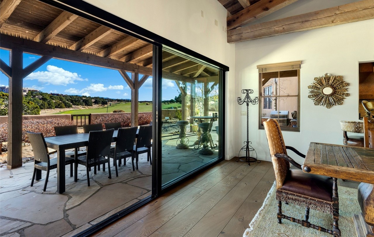 Covered PatioExposed BeamsFloor To Ceiling WindowsSliding Glass DoorsOutdoor Dining TableHigh CeilingsPergola OverhangPanoramic Rural Views