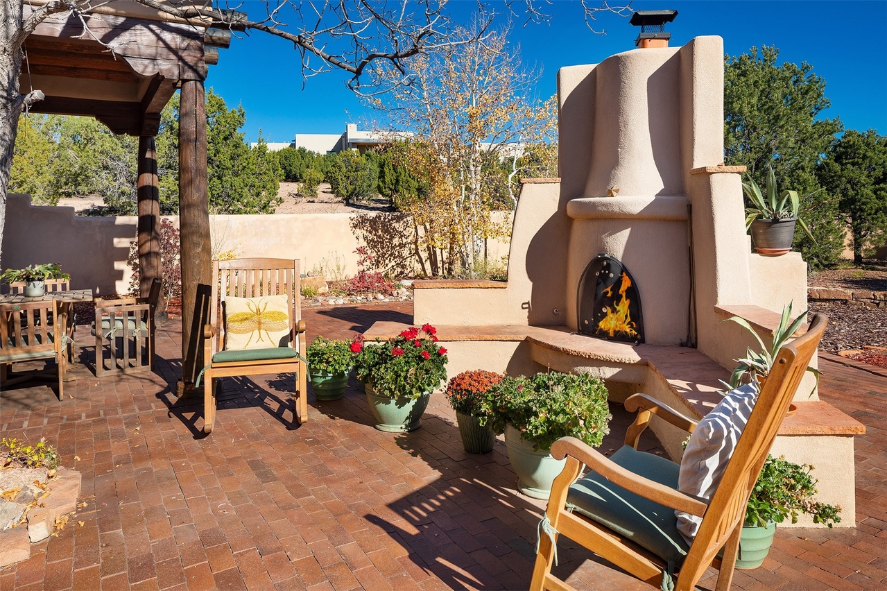 A stunning desert southwest patio featuring sculptural stucco fireplace architecture anchoring a serene outdoor living space with terracotta tile flooring and curated plantings. The warm earth-tone palette and mixed wooden seating create an inviting, sophisticated retreat that seamlessly blends indoor comfort with outdoor living.
