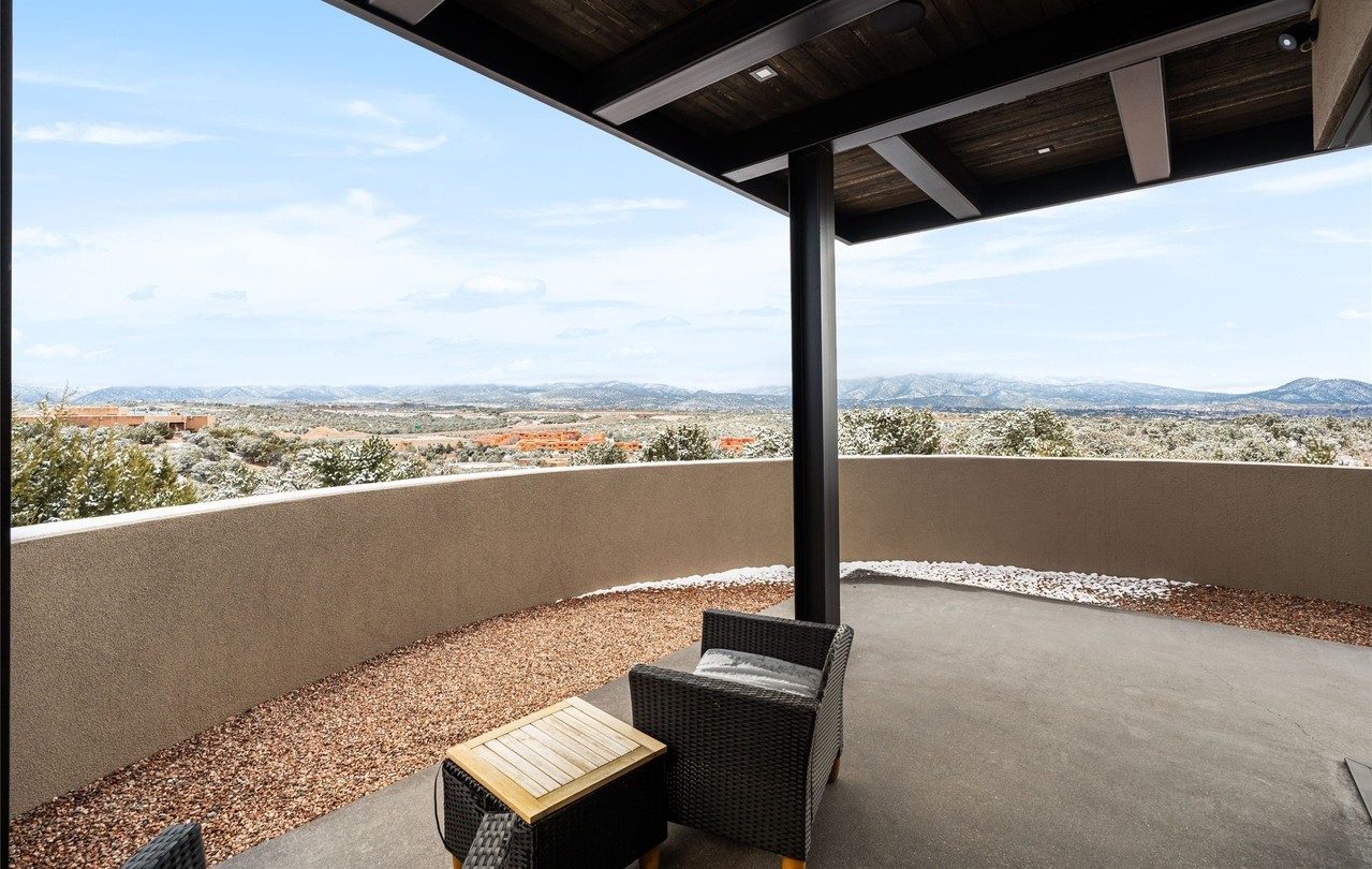 A sophisticated desert modern covered patio featuring panoramic views of an expansive arid landscape with distant mountains. The space combines a modern pergola with wood-plank ceiling and steel support columns, neutral tan stucco walls, and polished concrete flooring, anchored by minimalist black woven outdoor seating—creating an elegant indoor-outdoor living zone that celebrates the raw beauty of the desert environment.