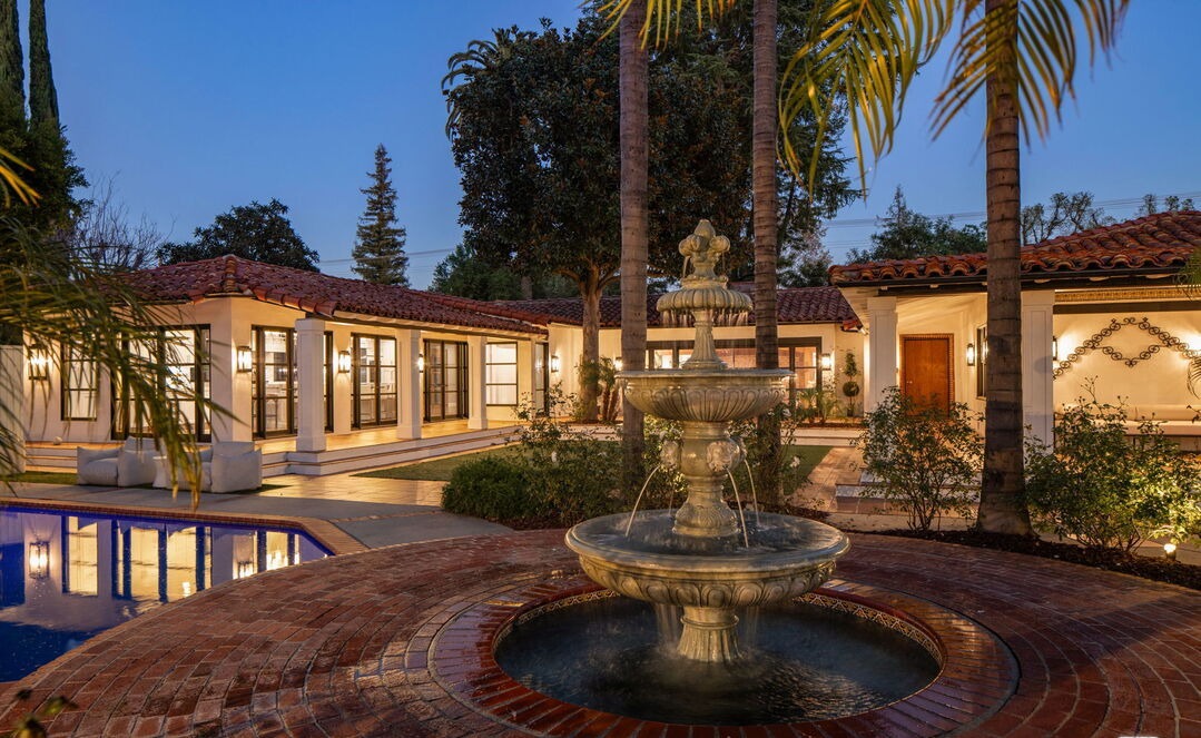 An exceptionally elegant Spanish Colonial courtyard with a striking tiered ornamental fountain as its centerpiece, surrounded by symmetrical cream-colored colonnaded structures with terracotta tile roofs and palm trees. The warm-toned clay brick flooring and sophisticated architectural detailing create a serene, resort-like outdoor living space that exemplifies high-end Mediterranean-influenced California luxury design.