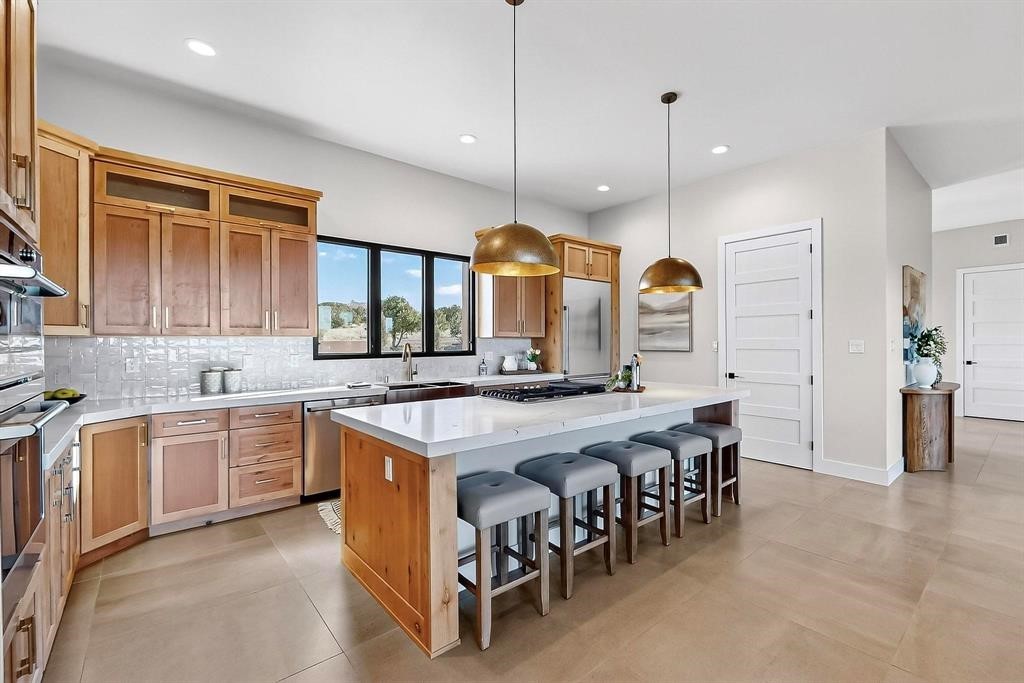 A sophisticated transitional kitchen combining warm honey-toned wood cabinetry with crisp white quartz countertops and a striking waterfall-edge island, anchored by sculptural brass dome pendant lights and abundant natural light from oversized windows. The space balances traditional millwork details with clean modern lines and premium materials, creating an inviting luxury kitchen with exceptional flow.