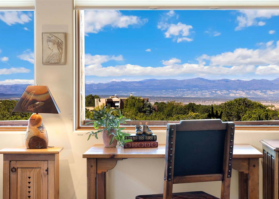 A sophisticated mountain-view home office featuring a custom light wood desk positioned beneath expansive floor-to-ceiling windows overlooking a valley and distant peaks, dressed with transitional furnishings and warm earth-tone accents. The space exemplifies organic modern design through natural materials, abundant natural light, and carefully curated decor that balances luxury with understated elegance.