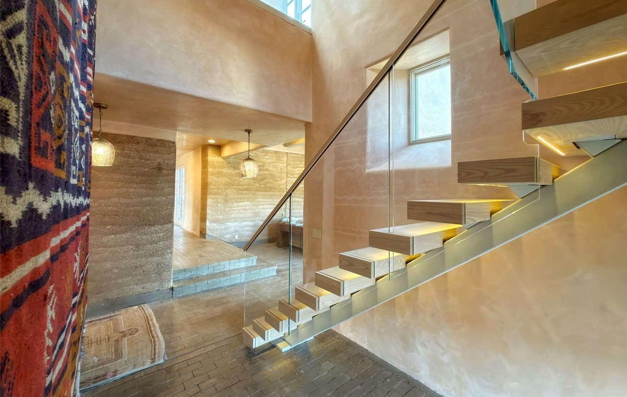 A stunning contemporary floating staircase featuring warm-toned natural wood treads with integrated LED underlighting and minimalist glass railings, set within a double-height void with abundant skylighting and warm plaster walls. The space exemplifies modern luxury with sculptural design, premium materials, and sophisticated lighting design that creates both drama and serenity.