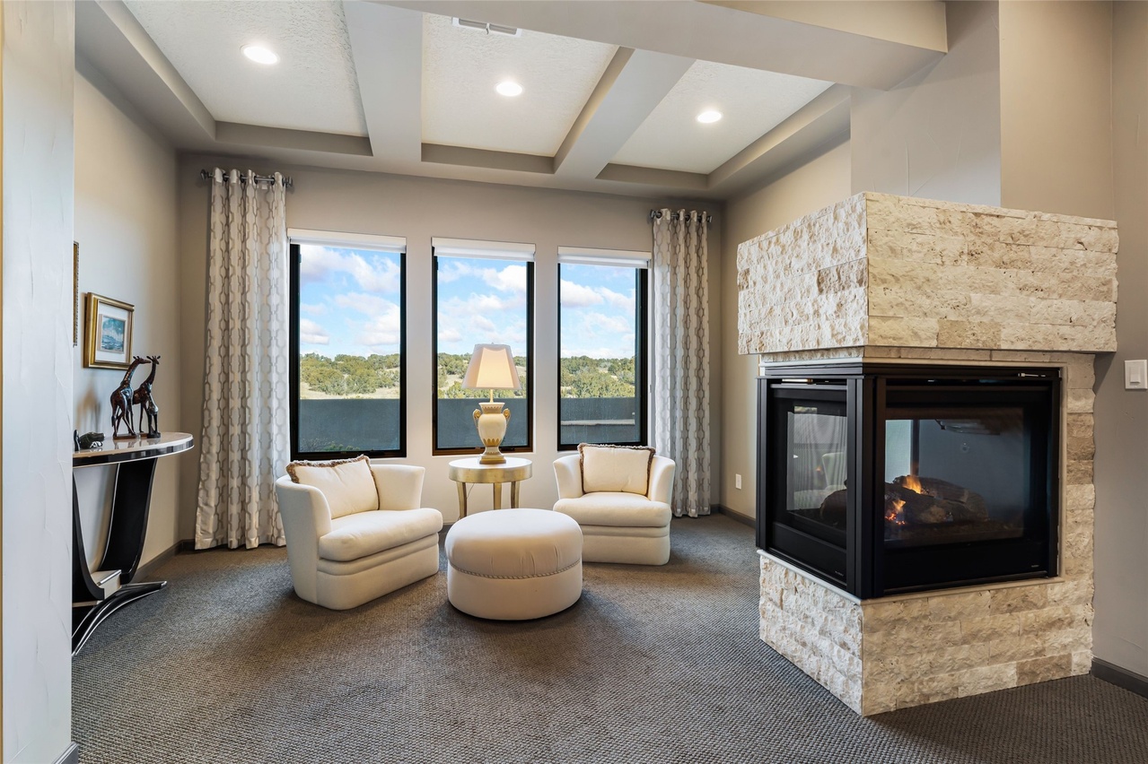 An elegantly appointed modern living room featuring a three-sided fireplace with natural stone surround, thoughtfully arranged cream-toned seating, and dramatic floor-to-ceiling windows showcasing scenic outdoor views. The coffered ceiling with integrated recessed lighting and refined color palette of warm neutrals with brass accents create a sophisticated, serene atmosphere that balances contemporary comfort with transitional design sensibility.