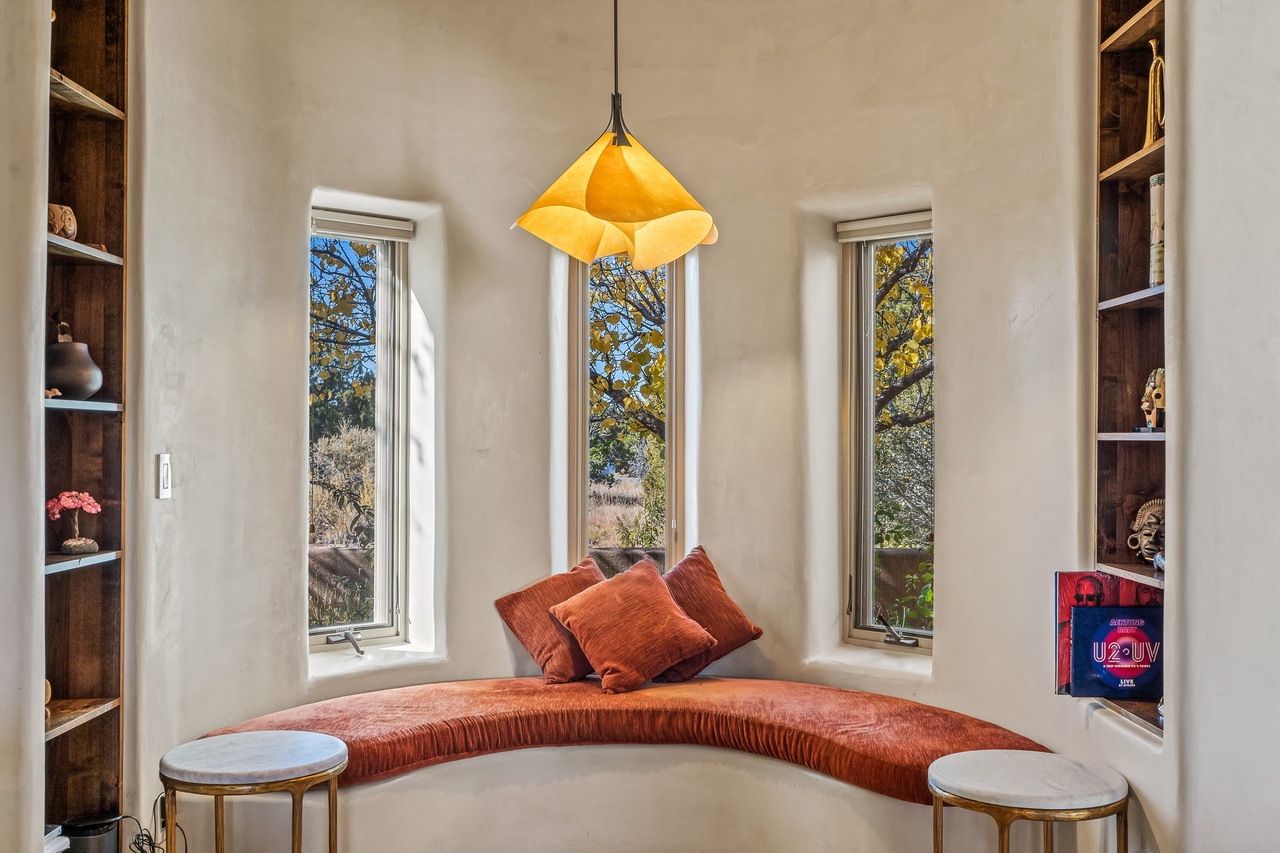 A serene window-seat nook featuring a curved burnt-orange upholstered bench centered between three tall windows framing pastoral landscape views, anchored by a sculptural golden-yellow pendant light and flanked by dark walnut built-in shelving within cream plaster walls. The design combines organic comfort with minimalist restraint, emphasizing natural light, warm materials, and curated negative space.