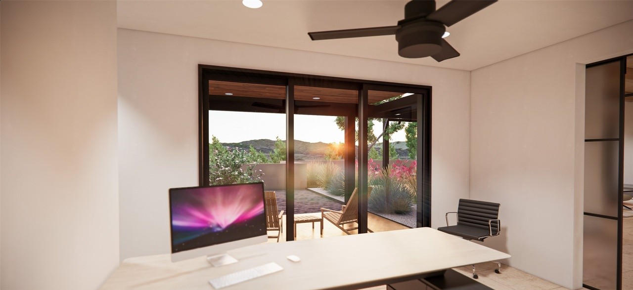 A sophisticated modern home office with seamless indoor-outdoor integration, featuring a concrete desk overlooking a serene desert landscape with native plantings and warm sunset lighting. The minimalist design pairs warm neutrals with dramatic floor-to-ceiling glazing, creating an inspiring yet tranquil workspace that celebrates the natural environment.