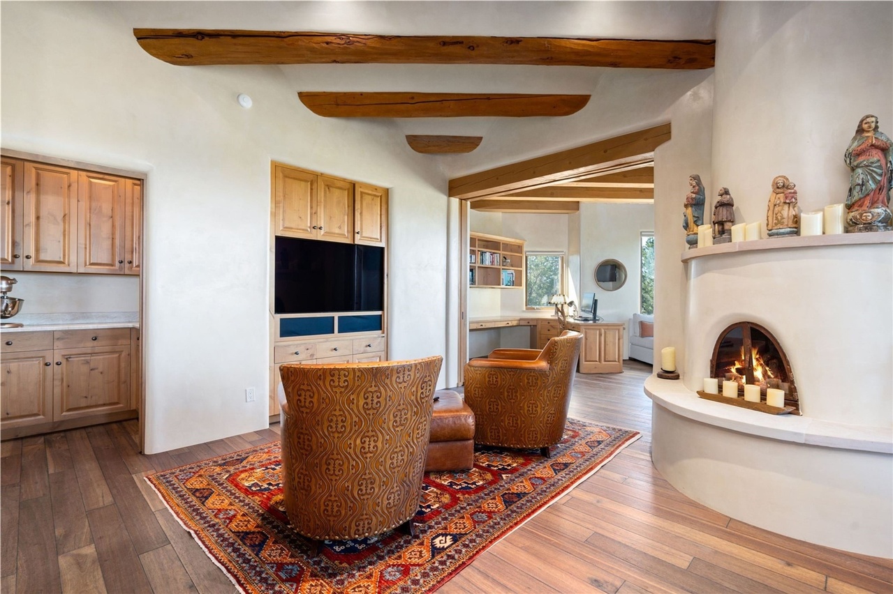 A sophisticated open-concept living room featuring exposed wood beams and a sculptural curved fireplace, anchored by patterned earth-tone furnishings and warmed by abundant natural light. The space seamlessly blends traditional architectural details with contemporary comfort, creating an elevated yet inviting sanctuary.