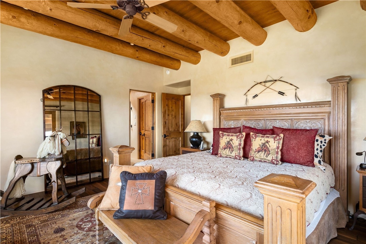 A masterfully designed primary bedroom featuring rustic-luxe elements with authentic timber vigas (exposed wooden beams), a hand-carved wooden headboard with ornate detailing, and a refined palette of warm creams and burgundy accents. The space balances rustic architectural elements with sophisticated furnishings and high-end textiles, exemplifying desert southwest design with timeless transitional appeal.