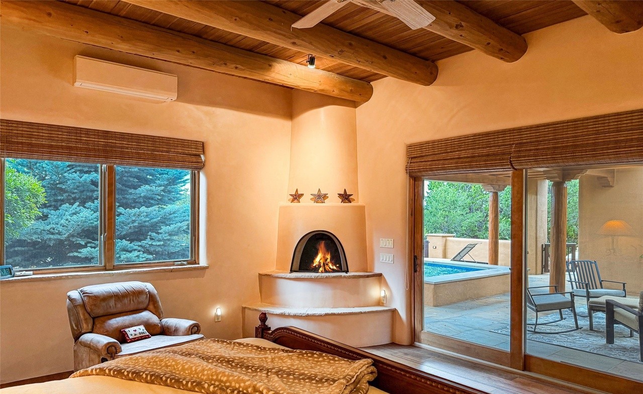 A breathtaking primary bedroom showcasing desert-modern design with warm terracotta venetian plaster walls, dramatic exposed timber ceiling beams, and a striking sculptural fireplace as the focal point. The space seamlessly blends luxury with organic warmth, featuring abundant natural light, direct pool access via glass doors, and carefully curated furnishings that honor both contemporary comfort and southwestern aesthetic.