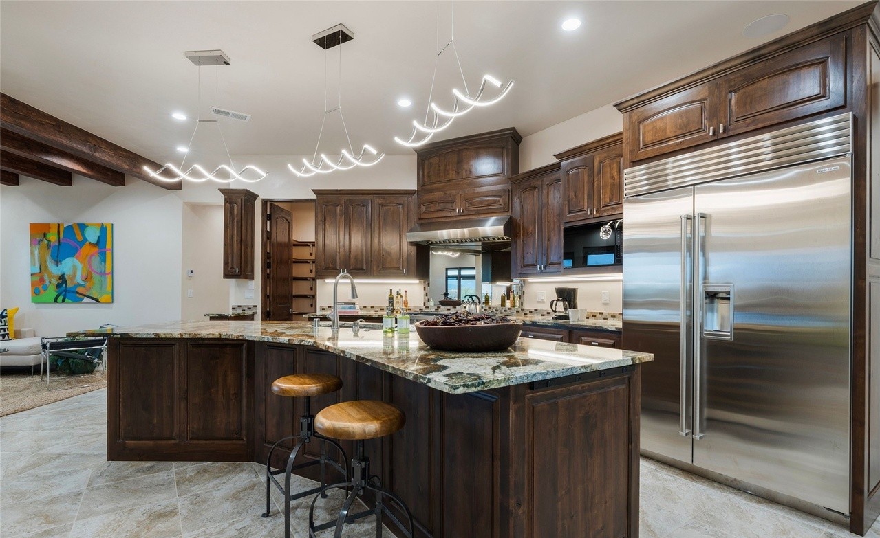 A stunning high-end kitchen featuring rich dark wood cabinetry, granite countertops, and a striking linear statement light fixture that anchors the space with modern elegance. The large waterfall-edge island, premium stainless steel appliances, and open-concept layout create a sophisticated, functional entertainer's kitchen with warm, welcoming character enhanced by exposed ceiling beams and abundant natural light.