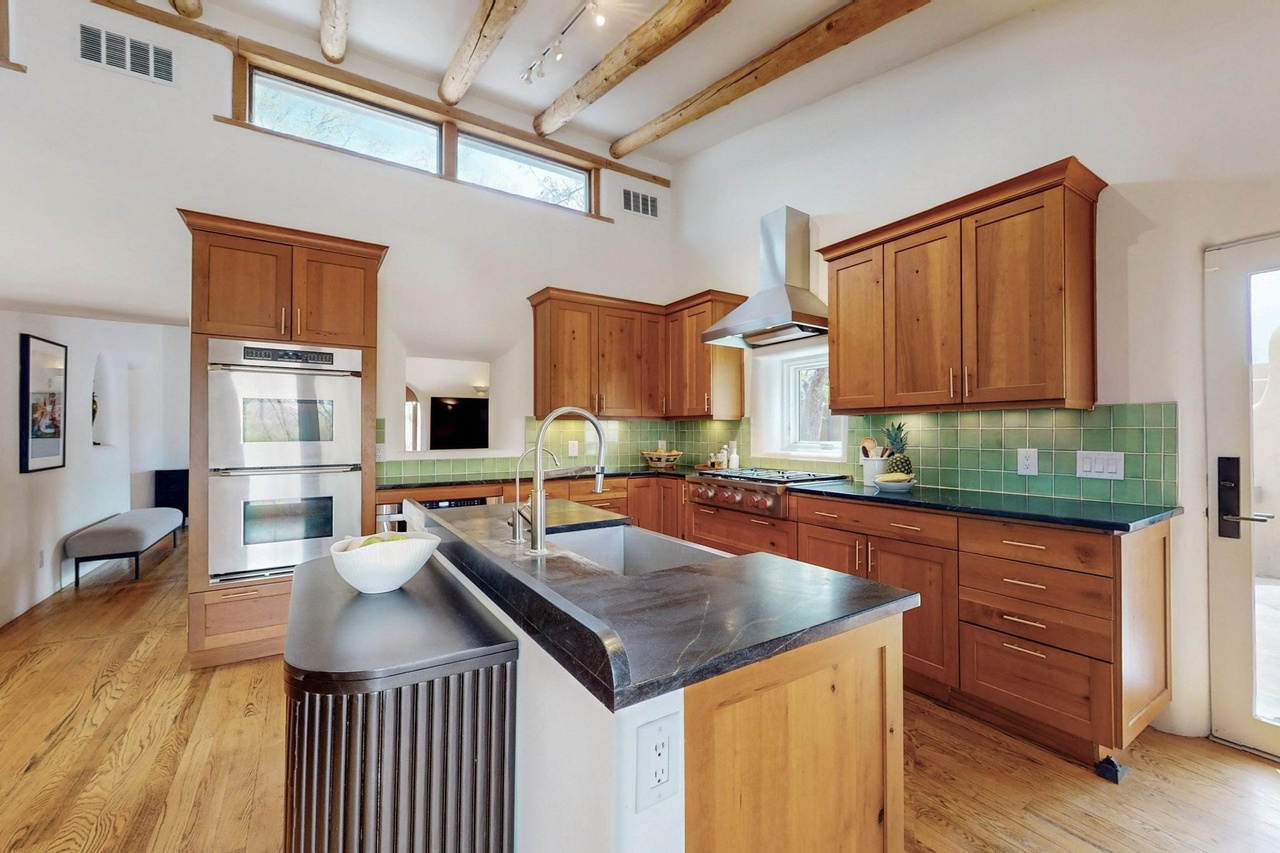 A sophisticated transitional kitchen featuring warm cherry-stained cabinetry, slate waterfall-edge countertops, and a striking sage-green ceramic tile backsplash that adds contemporary character to a traditionally-proportioned space. Exposed timber ceiling beams, abundant skylighting, and a thoughtfully-scaled island create an inviting, chef-worthy kitchen that balances timeless elegance with modern functionality.