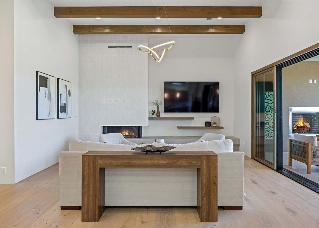 A sophisticated living room featuring warm organic-modern design with exposed timber beams, a contemporary fireplace, and carefully curated mid-tone furnishings that balance minimalist restraint with material warmth. The space achieves luxury through material quality and thoughtful proportions rather than ornamentation, with abundant natural light and seamless integration of modern media within a refined aesthetic.