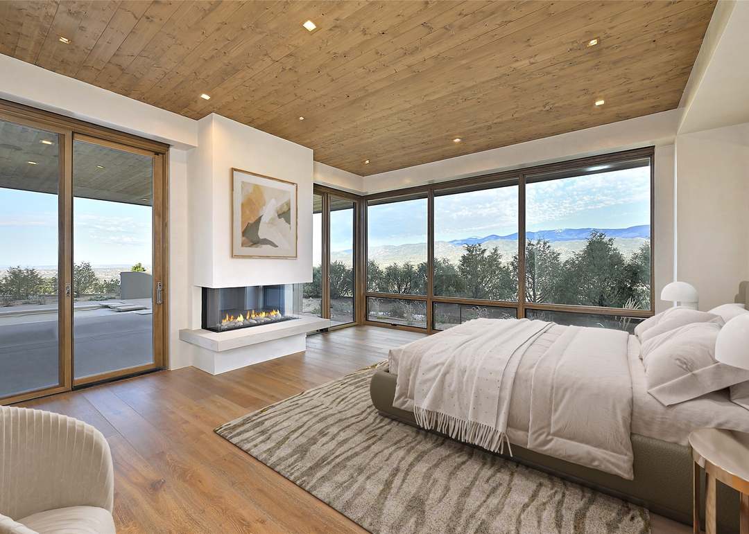 A breathtaking primary bedroom suite with expansive floor-to-ceiling windows framing panoramic mountain and valley views, featuring a sophisticated organic modern design with warm wood plank ceiling, modern fireplace, and curated minimalist furnishings. The space seamlessly blends luxury comfort with serene natural aesthetics through thoughtful material selection and abundant natural light.