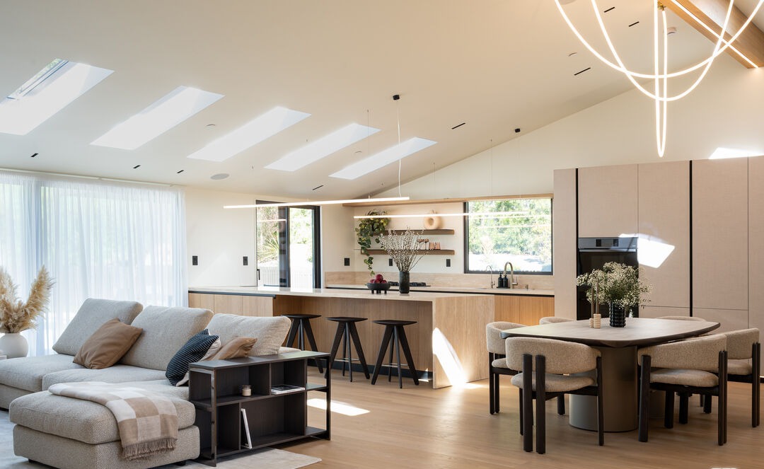 A stunning open-concept living, dining, and kitchen space featuring abundant natural light from skylights and floor-to-ceiling windows, warm wood and cream tones with sophisticated black accents. The design blends organic modern warmth with transitional details, showcasing custom millwork, minimalist flat-panel cabinetry, and sculptural pendant lighting throughout a seamlessly integrated floor plan.