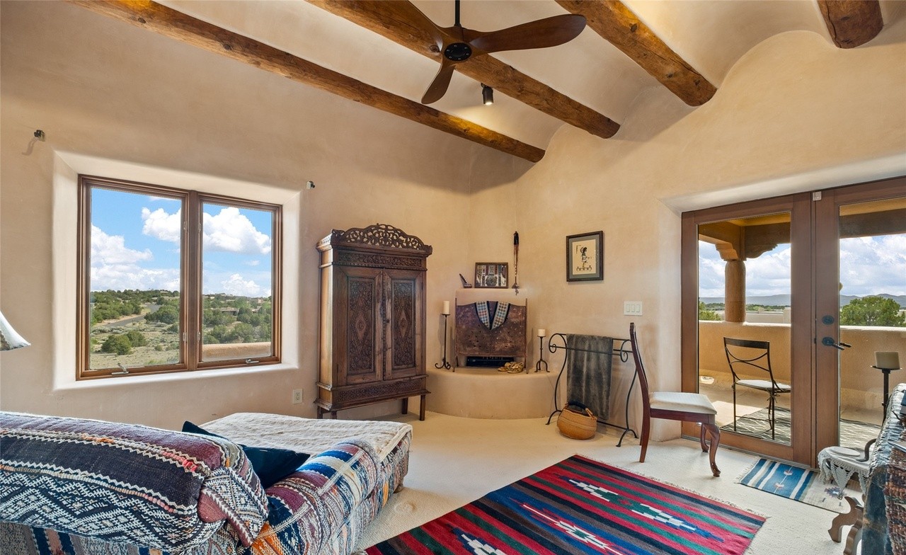 A stunning primary bedroom suite featuring dramatic exposed timber beams, warm Venetian plaster walls, and polished concrete flooring that captures sweeping desert vistas through extensive glazed walls. The space masterfully blends desert modernism with organic luxury through layered textures—hand-woven textiles, ornate carved furniture, and artisanal pottery—creating a serene sanctuary with gallery-like proportions and museum-quality finishes.