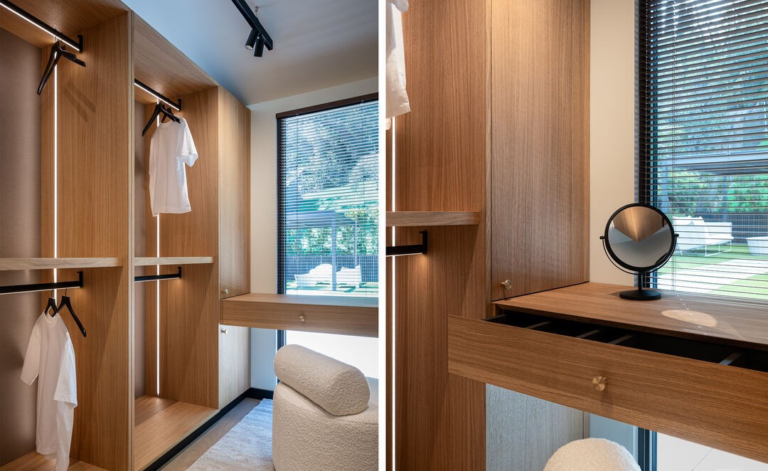 A sophisticated primary bedroom suite featuring warm-toned walnut cabinetry and custom millwork that seamlessly integrates a spacious walk-in closet, dressing area, and bedroom. The design balances minimalist restraint with organic warmth through natural wood finishes, integrated lighting, and abundant natural light from floor-to-ceiling windows, creating a serene and luxurious retreat.