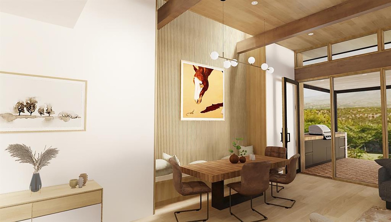 A sophisticated open-concept dining room featuring warm-toned natural wood ceilings with exposed beams, a vertical wood-slat accent wall, and expansive floor-to-ceiling windows overlooking desert landscape. The space showcases organic modern design with a walnut wood dining table, warm leather cantilever chairs, and contemporary pendant lighting, blending indoor-outdoor living with earthy materials and abundant natural light.